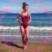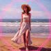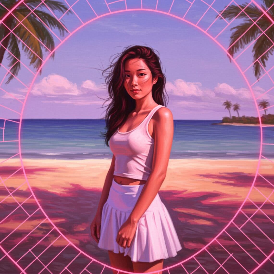 Neon-pink outline canvas of diamonds with modern airbrush oil painting with predominant colors such as red shades, pink shades, purple shades, orange shades, lemon shades of: of a young, slender Asian woman standing on a sunny beach during the daytime. She is wearing a white, fitted tennis skirt and a simple tank top with subtle arm cutouts, her hair slightly blowing in the wind. Her expression is confident and serene, embodying a sense of summer joy. The background features a calm sea and a clear sky, with a few distant palm trees, maintaining a focus on the woman. The scene is bathed in bright, natural sunlight, creating a vibrant and refreshing atmosphere without any distracting elements. BACKGROUND STYLE: Motion blur.