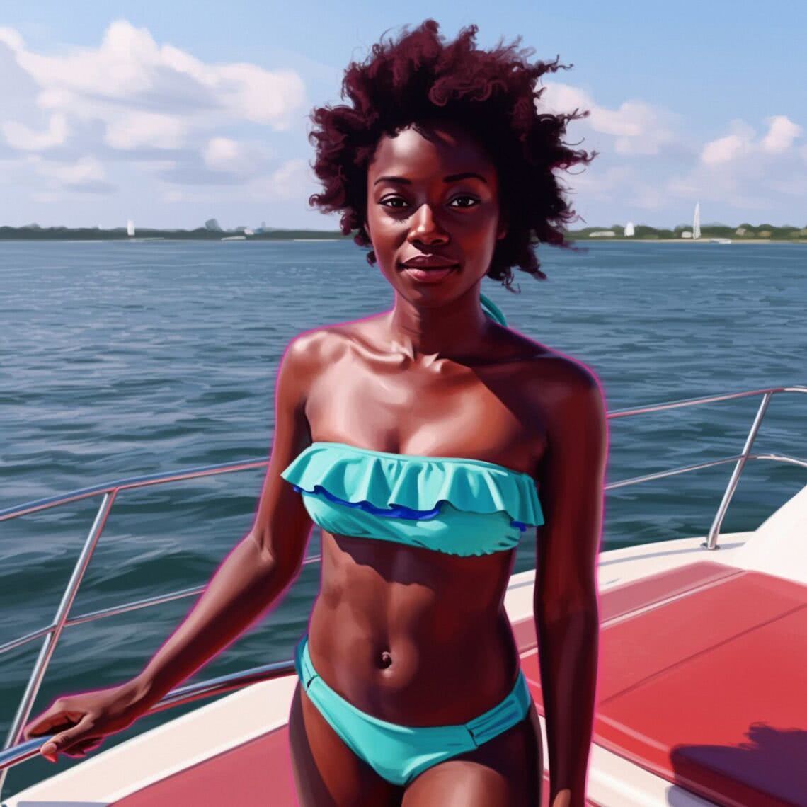 Neon-pink outline canvas of diamonds with modern airbrush oil painting with predominant colors such as red shades, pink shades, purple shades, orange shades, lemon shades of: of a young African woman with a short afro hairstyle and dark skin, standing confidently on the deck of a yacht. She is wearing a turquoise and cobalt blue bandeau bikini with delicate ruffles, with her hair slightly moved by a gentle breeze. The background features a calm sea and a sunny horizon, creating a serene and joyful atmosphere. The scene is set in natural daylight, emphasizing a safe and family-friendly environment. The focus is primarily on her face and upper body, capturing her expression of confidence and happiness. The composition avoids any distracting elements, keeping the focus on the main subject. BACKGROUND STYLE: Motion blur.