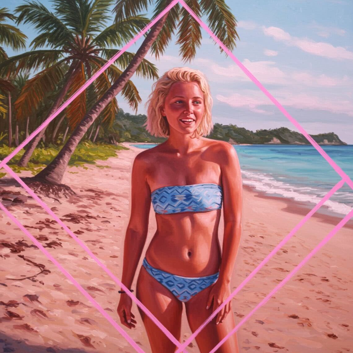 Neon-pink outline canvas of diamonds with modern airbrush oil painting with predominant colors such as red shades, pink shades, purple shades, orange shades, lemon shades of: of a young Swedish blonde woman with short blonde hair and a simple bangs, wearing a bandeau bikini with geometric patterns in soft blue tones, standing on a tropical beach. The beach features sandy shores, tall palm trees, and a clear blue ocean in the background. She is in a relaxed pose, smiling, with a playful and casual beach vibe. The scene is set during the day with bright, natural lighting, enhancing the tropical setting without any distracting elements. The overall composition focuses primarily on her, ensuring she remains the central figure in a safe and inviting environment. BACKGROUND STYLE: Motion blur.