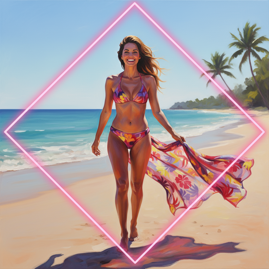 Neon-pink outline canvas of diamonds with modern airbrush oil painting with predominant colors such as red shades, pink shades, purple shades, orange shades, lemon shades of: of a confident woman standing on a sunny beach, wearing a stylish, tropical-colored bikini with high-cut bottoms and triangular tops that subtly highlights her curves. She has a joyful smile and her hair is gently blowing in the wind. She holds a colorful pareo in her hand. The background features a calm sea with gentle waves and a few palm trees, under a clear blue sky. The scene is set in a light and humorous style, suitable for all audiences, with no explicit nudity. The focus is primarily on the woman, with the beach environment providing a serene and summery backdrop. BACKGROUND STYLE: Motion blur.