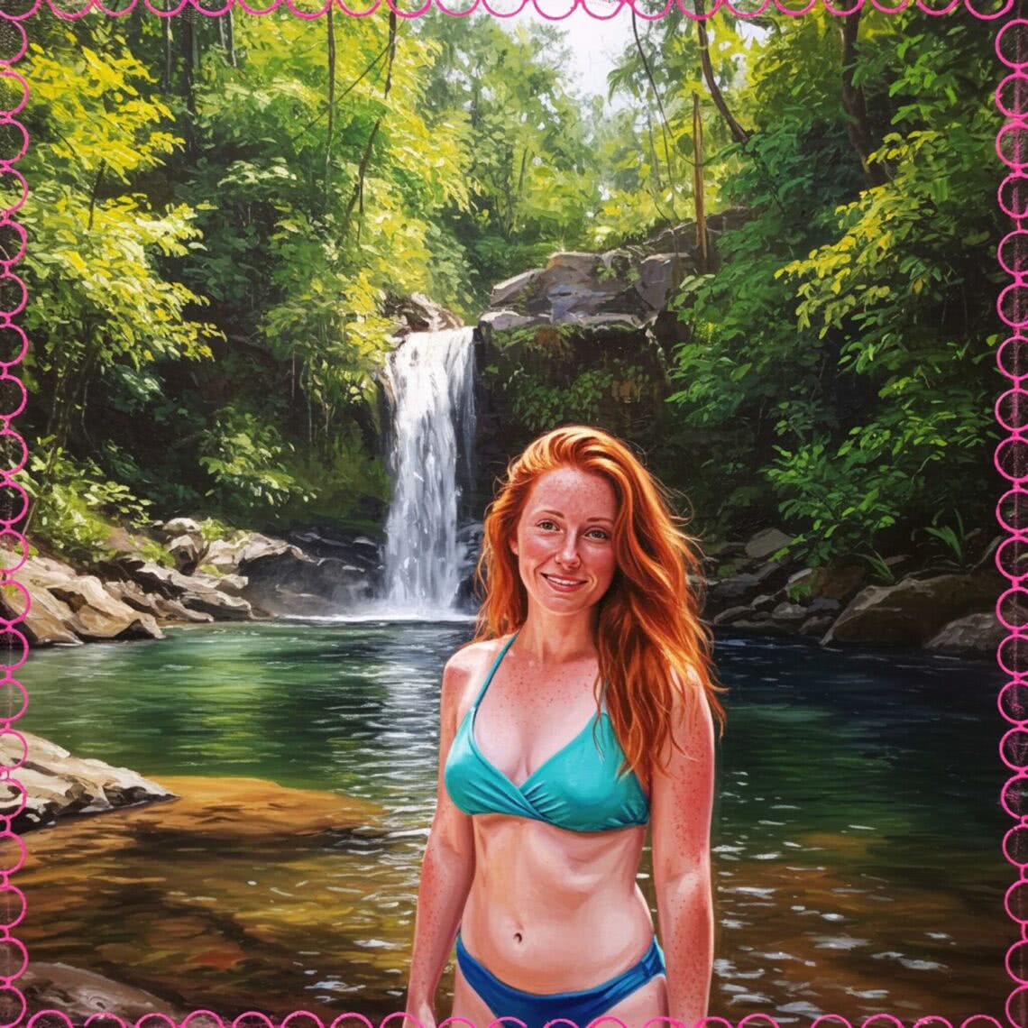 Neon-pink outline canvas of diamonds with modern airbrush oil painting with predominant colors such as red shades, pink shades, purple shades, orange shades, lemon shades of: of a woman with long, red, copper-colored hair, pale skin, and freckles, wearing an asymmetrical turquoise and cobalt blue bikini, standing by a crystal-clear river in a lush tropical jungle. The background features a waterfall and dense, vibrant green foliage. The scene is set during the day with natural sunlight filtering through the trees, creating a playful and adventurous mood. The woman has a gentle, inviting smile, and her hair is slightly tousled. The river reflects the surrounding environment, adding depth without distraction. The overall composition focuses on the woman, ensuring she remains the central subject in this serene yet lively setting. BACKGROUND STYLE: Motion blur.