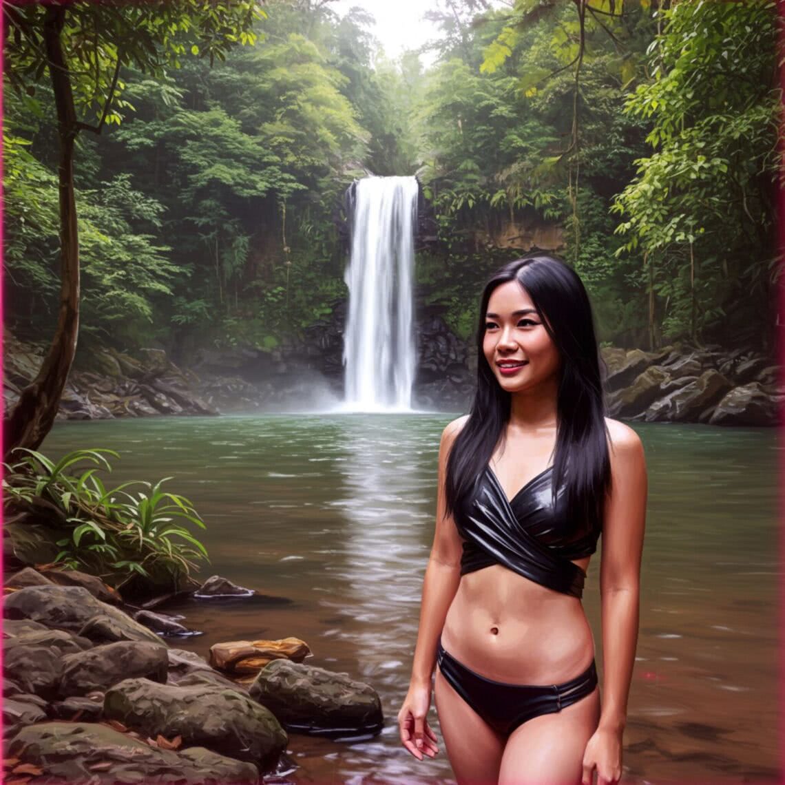 Neon-pink outline canvas of diamonds with modern airbrush oil painting with predominant colors such as red shades, pink shades, purple shades, orange shades, lemon shades of: of a young Thai woman with long black hair and a side part, standing by a river in a lush jungle. She is wearing a black wrap-around bikini with shiny accents, smiling naturally. In the background, a waterfall cascades gently, surrounded by dense, verdant foliage. The scene is set during the day with soft, natural lighting filtering through the trees, creating a serene and inviting atmosphere. The composition focuses primarily on the woman, with the jungle and waterfall providing a picturesque backdrop, enhancing the sense of freedom and adventure without any explicit nudity. BACKGROUND STYLE: Motion blur.