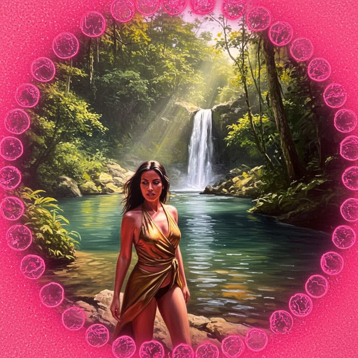Neon-pink outline canvas of diamonds with modern airbrush oil painting with predominant colors such as red shades, pink shades, purple shades, orange shades, lemon shades of: of a Spanish woman with dark hair and olive skin, wearing an elegant metallic gold wrap-style bikini, standing beside a crystal-clear river in a lush jungle. The background features a distant waterfall surrounded by dense greenery, with sunlight filtering through the trees. The woman’s face and expression convey joy and adventure, with her hair gently blowing in the breeze. The scene is set during the day, emphasizing a natural and serene environment without any distracting foreground elements or modern intrusions. The overall composition highlights the beauty of the natural setting and the woman’s serene presence within it. BACKGROUND STYLE: Motion blur.