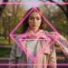 Neon-pink outline canvas of diamonds with modern airbrush oil painting with predominant colors such as red shades, pink shades, purple shades, orange shades, lemon shades of: Neon-pink outline canvas of diamonds with modern airbrush oil painting with predominant colors such as red shades, pink shades, purple shades, orange shades, lemon shades of: A stylish young woman confidently walking through a snowy urban street in winter, wearing gray suede laced ankle boots with thick treaded soles and visible lacing up to the ankle, paired with a flowing midi wool dress in neutral tones and an oversized coat. The scene evokes London street style with misty fog, light snowfall, and cobblestone paths, highlighting the boots’ durability and elegance in soft gray shades, feminine and empowering vibe, safe and fashionable illustration. BACKGROUND STYLE: Motion blur. BACKGROUND STYLE: Motion blur.