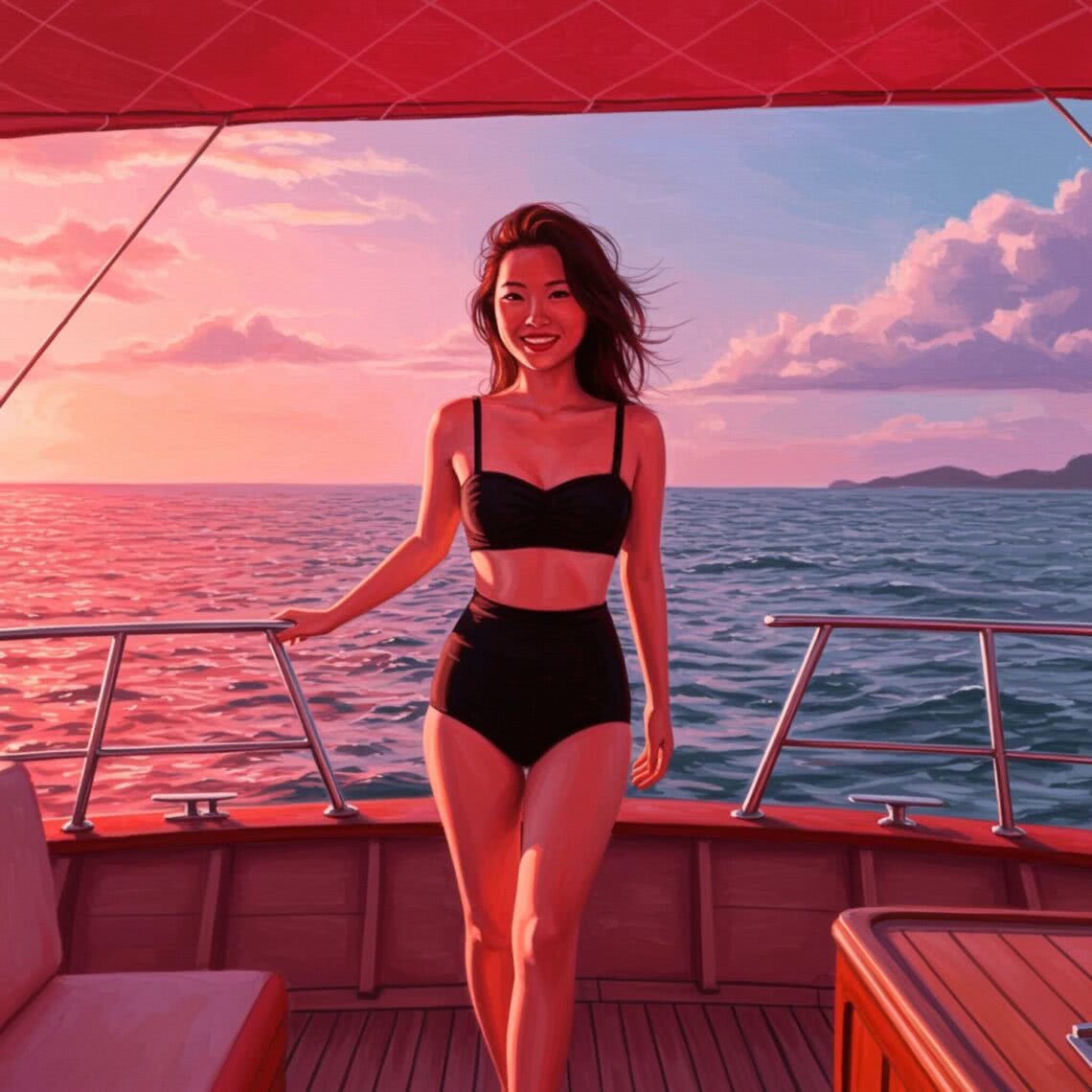 Neon-pink outline canvas of diamonds with modern airbrush oil painting with predominant colors such as red shades, pink shades, purple shades, orange shades, lemon shades of: of a slender Asian woman in her mid-20s, wearing a black, high-waisted two-piece swimsuit that highlights her waist, standing on the deck of a vintage-style yacht. She has a gentle smile and her hair is slightly tousled by a sea breeze. The background features a calm ocean with gentle waves and a clear sky with a few clouds, set during a sunny day. The yacht’s wooden deck and retro design elements enhance the 1950s aesthetic. The scene exudes a warm, sunny beach atmosphere, suitable for all audiences, with no explicit nudity. BACKGROUND STYLE: Motion blur.