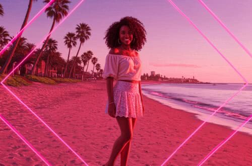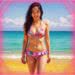 Neon-pink outline canvas of diamonds with modern airbrush oil painting with predominant colors such as red shades, pink shades, purple shades, orange shades, lemon shades of: of a woman with Spanish features, dark hair, and olive skin, wearing a high-waisted, two-piece bikini with tropical palm patterns, walking along a beach with golden sand and a turquoise ocean in the background. She wears a straw hat and round sunglasses, enhancing the retro beach vibe. The scene is set during a sunny day with gentle waves visible in the background. The composition focuses primarily on her, with a soft, natural lighting that creates a warm and inviting atmosphere, devoid of any explicit nudity or distracting elements, ensuring the image is safe for all audiences. BACKGROUND STYLE: Motion blur.