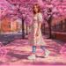 Neon-pink outline canvas of diamonds with modern airbrush oil painting with predominant colors such as red shades, pink shades, purple shades, orange shades, lemon shades of: A vibrant spring illustration of a young woman with fair, pale skin glowing with a fresh, natural radiance. She stands confidently in a blooming park, wearing a soft coral blouse tucked into neutral pants, paired with a peach-colored scarf fluttering in the breeze. Subtle makeup features peach blush on her cheeks and coral lipstick, enhancing her warm undertones without exaggeration. Surrounding her are soft pink and orange peach blossoms and coral-hued flowers, symbolizing renewal. The style is whimsical and uplifting, in pastel tones with a gentle glow effect, evoking elegance and subtle femininity. BACKGROUND STYLE: Motion blur.