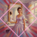 Neon-pink outline canvas of diamonds with modern airbrush oil painting with predominant colors such as red shades, pink shades, purple shades, orange shades, lemon shades of: of a young Swedish blonde woman with light skin and short, straight blonde hair with a fringe, wearing a retro-style one-piece swimsuit with ruffles on the bust, high-waisted, and tie-dye patterns in vibrant orange and pink. She is smiling and relaxing by a luxurious pool surrounded by palm trees and elegant sun loungers, on a sunny day. The pool area is set in a safe and family-friendly environment with a clear blue sky and a few clouds in the background, creating a warm and inviting atmosphere without any distracting elements. BACKGROUND STYLE: Motion blur.