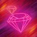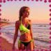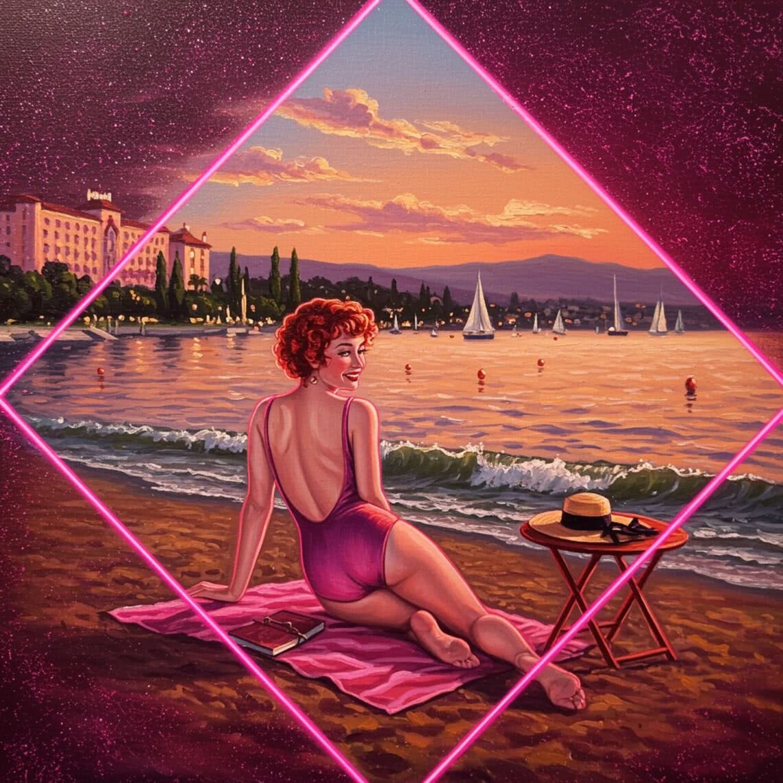 Neon-pink outline canvas of diamonds with modern airbrush oil painting with predominant colors such as red shades, pink shades, purple shades, orange shades, lemon shades of: of a slender woman with short, curly red hair, wearing a one-piece swimsuit with a deep back cutout in a gradient from violet to pink, relaxing on a beach by a lake. She is smiling and lying on a beach towel, with a small table beside her holding a sunhat and a book. In the background, a hotel and a marina with sailboats are visible under a clear sky with a few clouds. The scene is set in the late afternoon, providing a warm, natural light. The beach features gentle waves and a few distant palm trees, maintaining a serene and elegant atmosphere without any distracting foreground elements. BACKGROUND STYLE: Motion blur.