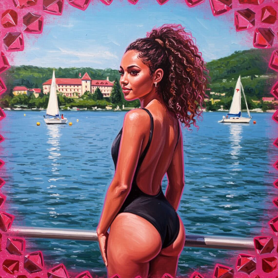 Neon-pink outline canvas of diamonds with modern airbrush oil painting with predominant colors such as red shades, pink shades, purple shades, orange shades, lemon shades of: of an elegant woman standing by a calm lake during the day. She wears a matte black one-piece swimsuit with shiny accents and a subtle back cutout. The woman has curly hair in a high ponytail, a golden complexion, and a radiant smile, exuding confidence. In the background, a distant hotel and sailboats on the tranquil lake are visible, surrounded by blue water and green surroundings, creating a serene and adventurous atmosphere. The scene is bright and full of positive energy, with no explicit nudity, ensuring it is safe for all audiences. BACKGROUND STYLE: Motion blur.