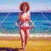 Neon-pink outline canvas of diamonds with modern airbrush oil painting with predominant colors such as red shades, pink shades, purple shades, orange shades, lemon shades of: of a woman with Spanish features standing confidently on a white sandy beach during a sunny day. She has dark, wavy hair and olive skin, wearing an elegant one-piece swimsuit with a deep back cutout and tropical palm patterns in shades of green, blue, and pink. She holds a straw hat in one hand and wears sunglasses, sporting a slight, friendly smile. The background features a clear blue ocean and tall palm trees, with a few clouds in the sky, maintaining a bright and cheerful atmosphere without distracting elements. The overall composition focuses on her, highlighting her elegance and the serene beach setting, suitable for all audiences. BACKGROUND STYLE: Motion blur.