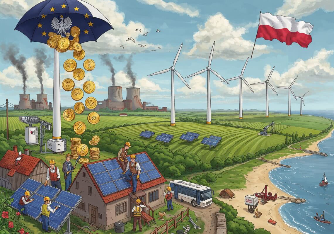Modern airbrush detailed painting with predominant vivid colors of: A vibrant, illustrative scene depicting Poland’s energy transformation: in the foreground, diverse Polish people (families, workers, and farmers) installing solar panels on rooftops and wind turbines on a Baltic coast, with a modern electric bus and heat pump visible nearby. In the background, fading coal power plants transition into lush green fields with offshore wind farms and biomass plants under a sunny sky. Symbolic elements include a flowing river of golden euros and złoty coins from an EU flag umbrella pouring into green energy projects, representing funding from the EU and national sources. The overall atmosphere is optimistic and forward-looking, with clean air, birds flying, and a Polish flag waving, emphasizing sustainability, jobs, and a brighter future. Style: colorful digital illustration, safe for all audiences, in a semi-realistic cartoon aesthetic. BACKGROUND STYLE: Motion blurred background style.