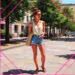Neon-pink outline canvas of diamonds with modern airbrush oil painting with predominant colors such as red shades, pink shades, purple shades, orange shades, lemon shades of: of a slender woman with short, curly red hair, wearing white lace shorts, a simple crop top, and sandals, standing confidently on a sunny city street in the afternoon. The scene captures her in a moment of self-assuredness, with natural sunlight highlighting her features and creating a warm, inviting atmosphere. The background features typical urban elements like buildings and trees, slightly blurred to focus on the woman. The overall composition emphasizes her presence and the summer setting without any distracting foreground elements or overly complex details, maintaining a safe and appealing visual for all audiences. BACKGROUND STYLE: Motion blur.