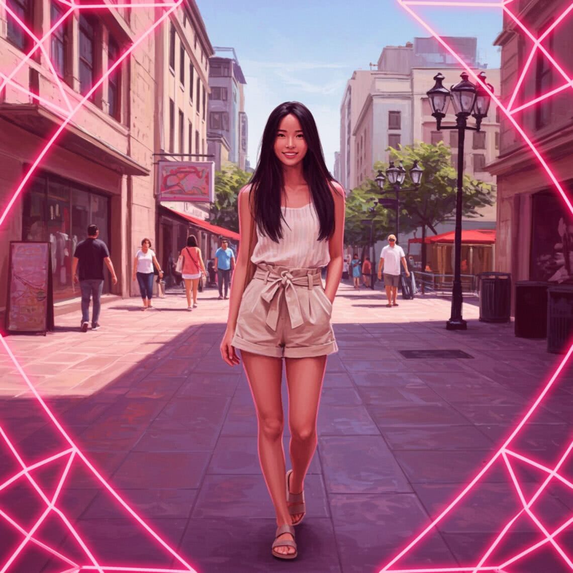 Neon-pink outline canvas of diamonds with modern airbrush oil painting with predominant colors such as red shades, pink shades, purple shades, orange shades, lemon shades of: of a young woman with long black hair and a slender build, wearing beige paperbag high-waisted shorts with a tie at the waist, a light, airy blouse on straps, and sandals. She stands confidently on a bustling summer street in a hot city, with a smile on her face, embodying a casual summer fashion style. The background features city buildings under a bright, sunny sky, with other pedestrians visible but not distracting from the main subject. The scene is set in the daytime, providing a cheerful and relaxed atmosphere without explicit nudity, ensuring it is safe for all audiences. BACKGROUND STYLE: Motion blur.