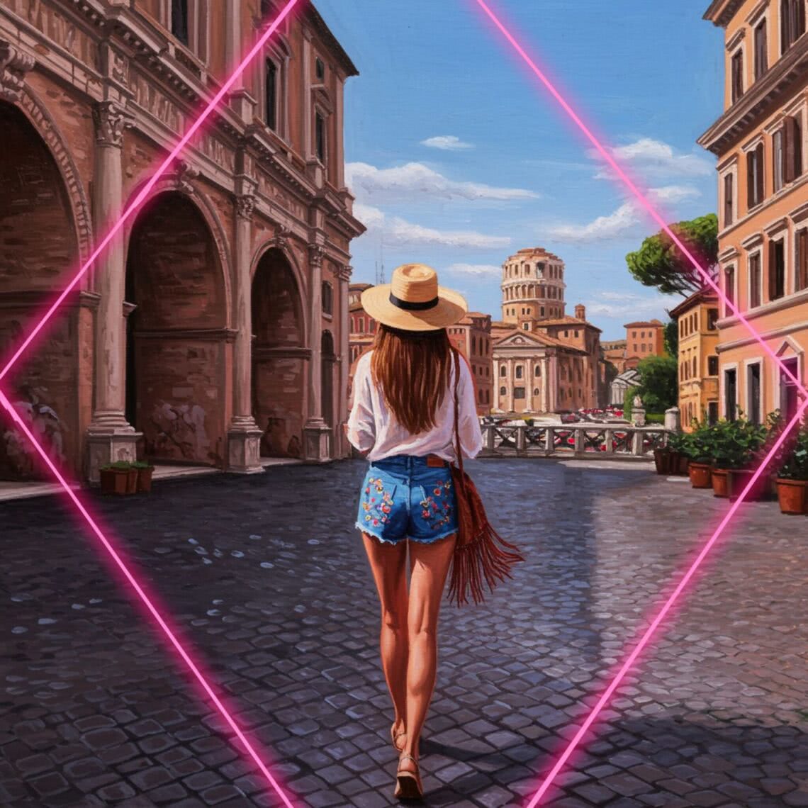 Neon-pink outline canvas of diamonds with modern airbrush oil painting with predominant colors such as red shades, pink shades, purple shades, orange shades, lemon shades of: of a slender brunette woman with long, straight hair and olive skin, wearing short denim shorts with delicate floral embroidery in pastel colors, paired with a loose white blouse and flat sandals. She is walking on a sunny cobblestone street in a Roman city during a hot summer day, wearing a wide-brimmed sun hat and carrying a fringed boho-style bag. The background features classic Roman architecture, including arches and a distant view of a famous landmark, under a clear blue sky with a few clouds. The scene exudes a subtle femininity and summery vibe, suitable for all audiences, with no explicit nudity. BACKGROUND STYLE: Motion blur.