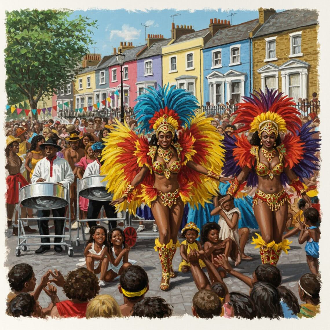 Modern airbrush detailed painting with predominant vivid colors of: A colorful illustration of the Notting Hill Carnival in London during the day, featuring a group of dancers in vibrant costumes adorned with feathers and sequins in red, yellow, green, and blue. The dancers are centrally positioned, filling the foreground, with musicians playing steel bands visible just behind them. The background shows colorful houses typical of Notting Hill, with a lively crowd of people dancing and enjoying the festival. The scene is filled with energy and joy, with a clear, sunny sky overhead, ensuring a safe and inclusive atmosphere for all viewers. BACKGROUND STYLE: Motion blur.