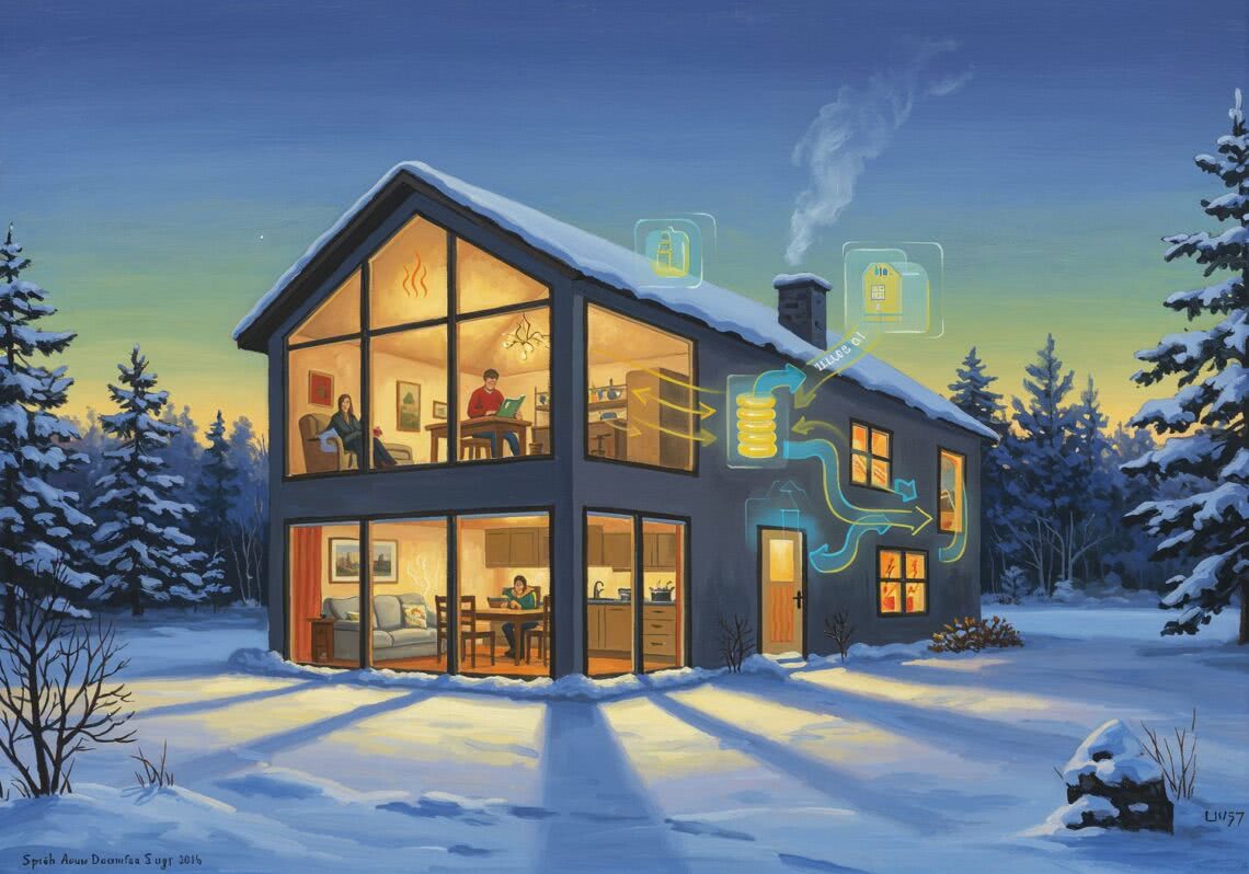 Modern airbrush detailed painting with predominant vivid colors of: A vibrant, illustrative image of a modern passive house in a snowy winter landscape, with thick insulated walls, large south-facing triple-glazed windows capturing sunlight, and a family inside comfortably relaxing—cooking in the kitchen, reading by a window, and playing—while subtle glowing icons represent heat from daily activities like breath and appliances warming the home. Fresh air flows through a ventilation system with heat recovery arrows, emphasizing energy efficiency and coziness, in a warm, eco-friendly color palette of greens, blues, and yellows, safe and family-oriented style. BACKGROUND STYLE: Motion blurred background style.
