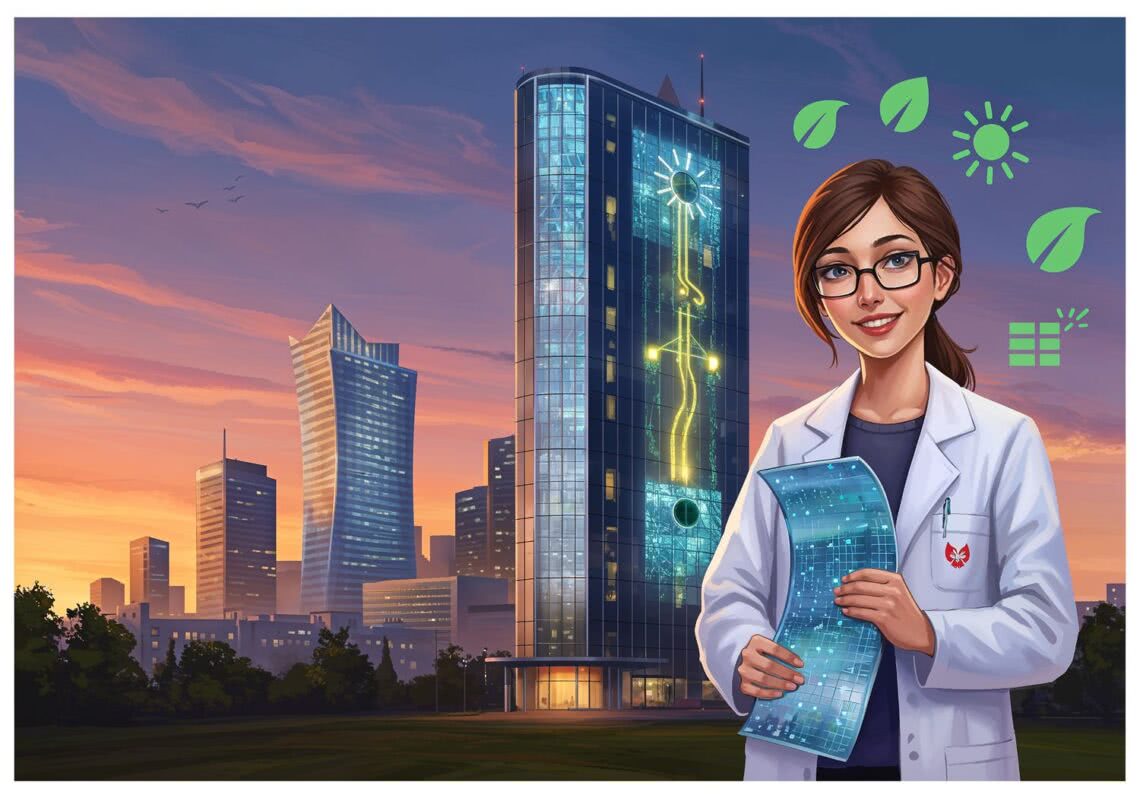 Modern airbrush detailed painting with predominant vivid colors of: A vibrant, futuristic illustration of a modern Polish cityscape at sunset, featuring a tall building in Warsaw with transparent windows and curved facade seamlessly integrated with glowing, flexible perovskite solar films that shimmer like iridescent ink, converting sunlight into energy visualized as soft golden streams flowing into a power grid icon. In the foreground, a confident young female Polish scientist in a lab coat holds a roll of thin, bendable solar material, smiling optimistically, with subtle Polish flag elements and green energy symbols like leaves and sun rays in the background. Style: clean, optimistic digital art, safe for all audiences, emphasizing innovation and sustainability. BACKGROUND STYLE: Motion blurred background style.
