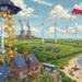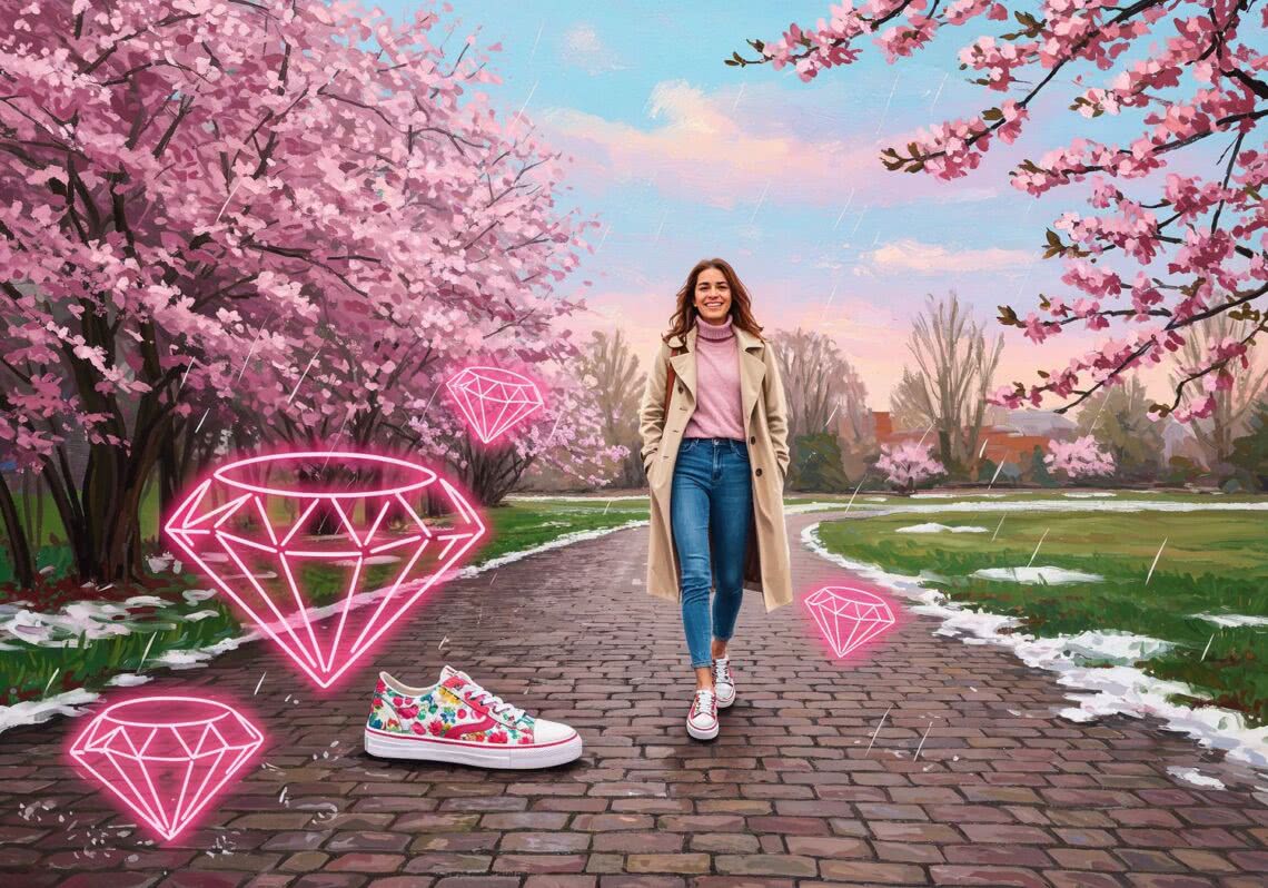 Neon-pink outline canvas of diamonds with modern airbrush oil painting with predominant colors such as red shades, pink shades, purple shades, orange shades, lemon shades of: A vibrant, whimsical illustration in a springtime style: A stylish young woman with a confident smile walks along a cobblestone path in early March Polish weather, wearing hybrid canvas sneakers with colorful floral prints on the canvas parts and protective leather inserts on the toes and sides. She’s dressed in high-waisted jeans, an oversized sweater, and a light trench coat, holding a small umbrella as light rain falls gently around blooming cherry blossoms and melting snow patches. Her feet are dry and comfortable, emphasizing style and practicality, with a sunny sky peeking through scattered clouds in pastel blues and pinks. Safe, uplifting, and fashionable vibe for a fashion blog. BACKGROUND STYLE: Motion blur.