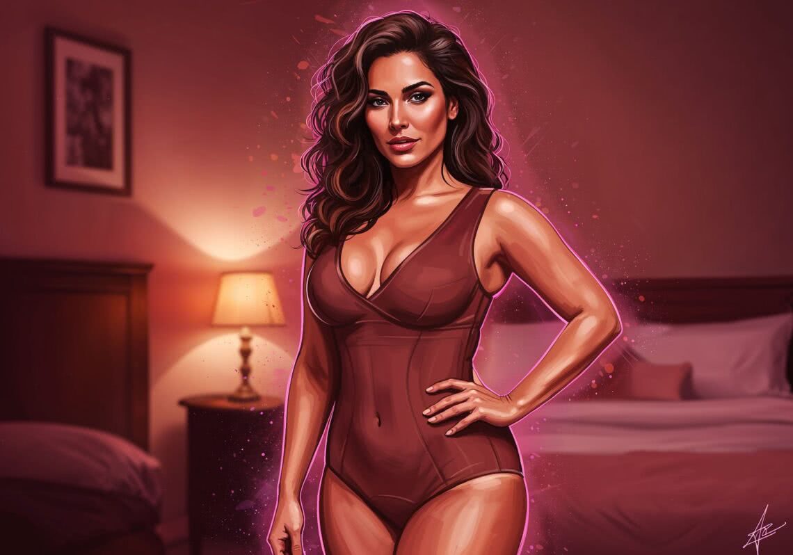 Neon-pink outline canvas of diamonds with modern airbrush oil painting with predominant colors such as red shades, pink shades, purple shades, orange shades, lemon shades of: A confident brunette woman in her 30s with warm olive skin, hourglass figure, and wavy shoulder-length hair cascading softly to frame her V-neckline, stands elegantly in a brown shaping bodysuit that accentuates her curves with subtle modeling panels and a discreet midriff cut-out. She has light smoky eye makeup, a subtle smile exuding empowerment and sensuality, posed gracefully with one hand on her hip in a softly lit bedroom setting, illustrative style with warm earthy tones and a touch of elegance. BACKGROUND STYLE: Motion blur.