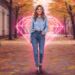 Neon-pink outline canvas of diamonds with modern airbrush oil painting with predominant colors such as red shades, pink shades, purple shades, orange shades, lemon shades of: A confident young woman with a diverse, hourglass figure stands in a softly lit bedroom, elegantly posing to showcase two lingerie sets side by side in a split composition. On the left, she wears a light blue fishnet long-sleeve top and high-waisted panties, with loose wavy hair cascading over her shoulders, evoking a fresh, playful summer vibe. On the right, she transitions to a black lace bra and flowing tulle mini-skirt, styled with a sleek high ponytail, radiating mysterious elegance. The illustration is in a fashionable, artistic style like a Vogue photoshoot, with empowering confidence, subtle shadows, and no nudity—focus on empowering sensuality, soft fabrics, and harmonious colors against a neutral background. BACKGROUND STYLE: Motion blur.