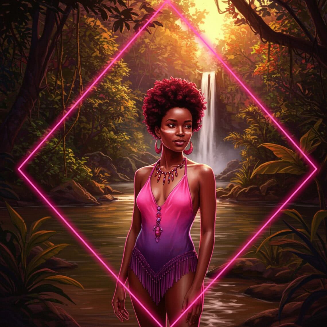 Neon-pink outline canvas of diamonds with modern airbrush oil painting with predominant colors such as red shades, pink shades, purple shades, orange shades, lemon shades of: of a woman with African features and dark skin, sporting a short afro, wearing a swimsuit with a gradient from purple to pink, adorned with beads and bohemian embroidery. She stands by a river in a lush jungle, with a waterfall visible in the background. The scene is set during the golden hour, providing a warm, natural light that highlights her serene expression and positive demeanor. The background features dense, vibrant foliage but remains soft and unfocused to keep the emphasis on the woman. The overall composition is peaceful and inviting, suitable for all audiences. BACKGROUND STYLE: Motion blur.