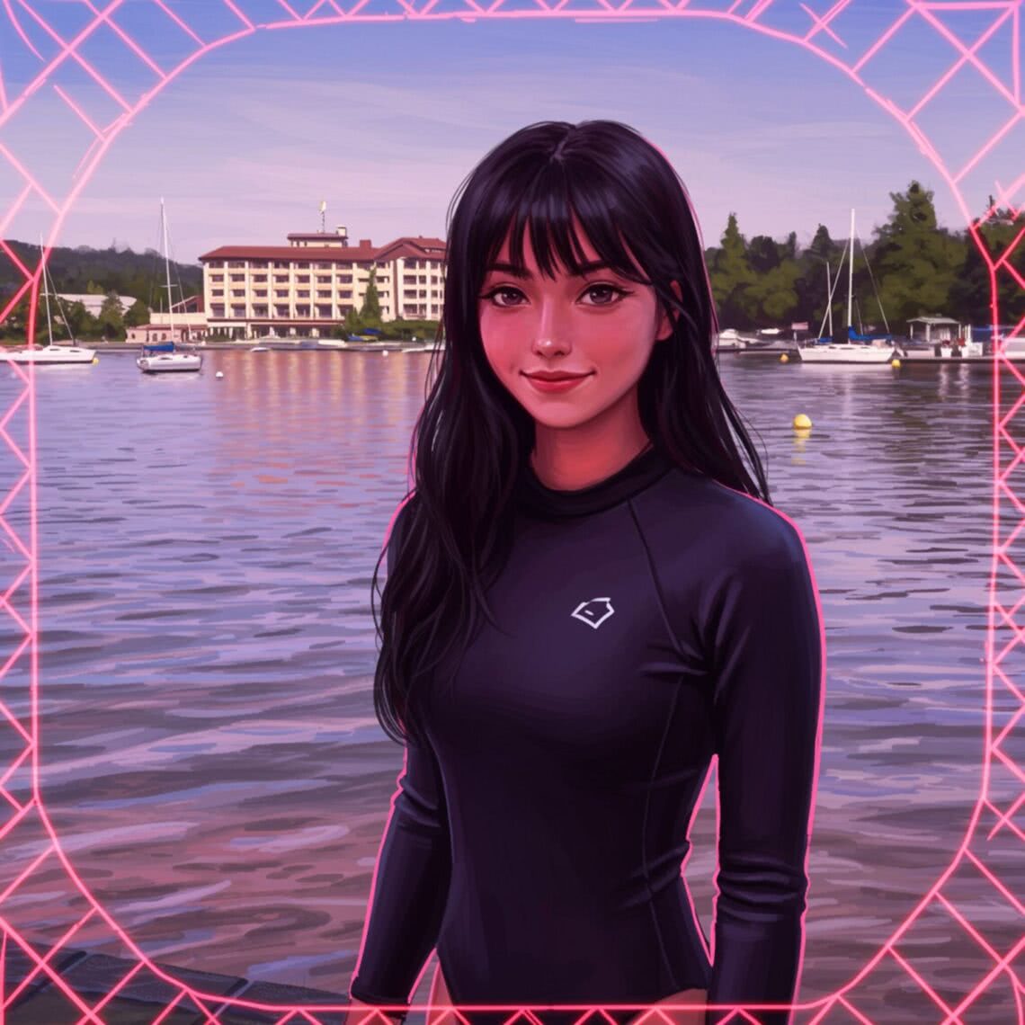 Neon-pink outline canvas of diamonds with modern airbrush oil painting with predominant colors such as red shades, pink shades, purple shades, orange shades, lemon shades of: of a young woman with delicate features and long black hair parted in the middle, wearing a black one-piece swimsuit with sleeves inspired by surfwear, standing by a lake. The scene is set during a sunny day with a relaxed, vacation-like atmosphere. In the background, there is a hotel and a marina with small sailboats, but they are subtle and do not distract from the main subject. The woman has a gentle smile, and the natural lighting enhances the serene mood. The overall composition focuses primarily on her, with a soft, natural background that includes the lake and distant greenery, maintaining a safe and family-friendly style. BACKGROUND STYLE: Motion blur.
