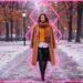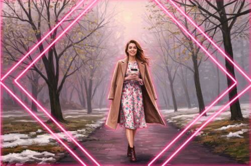 Neon-pink outline canvas of diamonds with modern airbrush oil painting with predominant colors such as red shades, pink shades, purple shades, orange shades, lemon shades of: Neon-pink outline canvas of diamonds with modern airbrush oil painting with predominant colors such as red shades, pink shades, purple shades, orange shades, lemon shades of: A cozy autumn scene featuring a stylish young woman walking through a golden-leafed park, wearing an oversized cream-colored cable-knit sweater with prominent twisted knit patterns, paired with slim blue jeans and brown leather ankle boots. She has a relaxed, confident smile, with soft wavy hair and minimal gold jewelry. The background shows falling leaves, warm sunlight filtering through trees, and a rustic chic vibe, evoking warmth and elegance for the 2025/2026 fashion season. Soft, inviting lighting, in a realistic illustration style. BACKGROUND STYLE: Motion blur. BACKGROUND STYLE: Motion blur.
