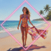 Neon-pink outline canvas of diamonds with modern airbrush oil painting with predominant colors such as red shades, pink shades, purple shades, orange shades, lemon shades of: of a woman with a diverse physique standing on a sunny beach, wearing a stylish floral tankini. She has a relaxed and confident smile with her hair gently blowing in the breeze. Beside her, a beach hat and a pareo are visible on the golden sand. The background features a calm sea with gentle waves and a clear blue sky under a warm summer sun. The scene is set in pastel and neon colors, creating a light and inspiring atmosphere focused on beach fashion. BACKGROUND STYLE: Motion blur.