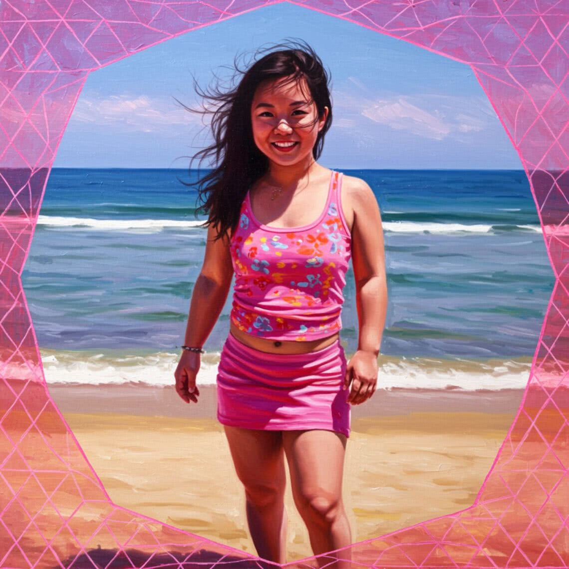 Neon-pink outline canvas of diamonds with modern airbrush oil painting with predominant colors such as red shades, pink shades, purple shades, orange shades, lemon shades of: of a petite Asian woman with delicate features, wearing a bright, colorful tank top and a matching mini skirt ending just above her knees, standing on a sunny beach. She has a confident smile and her hair and clothes are slightly moved by a gentle breeze. The background features a calm sea and sandy beach under a clear sky, with no distracting elements. The scene is set in bright, vibrant colors, emphasizing a cheerful and family-friendly atmosphere. The composition focuses primarily on her, with the beach environment providing a natural and inviting backdrop. BACKGROUND STYLE: Motion blur.