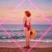 Neon-pink outline canvas of diamonds with modern airbrush oil painting with predominant colors such as red shades, pink shades, purple shades, orange shades, lemon shades of: of a slender young woman with long, curly red hair walking on a sandy beach during a hot summer day. She is wearing a short, tight white mini skirt and a semi-transparent oversized blouse with buttons undone to the middle, slipping off one shoulder. She exudes confidence and wears large sunglasses and a straw hat, smiling. The background features a golden sunset and a calm sea, with no distracting elements. The scene is serene and focused, emphasizing the woman’s relaxed and joyful demeanor in a safe, family-friendly setting. BACKGROUND STYLE: Motion blur.