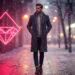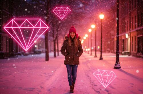 Neon-pink outline canvas of diamonds with modern airbrush oil painting with predominant colors such as red shades, pink shades, purple shades, orange shades, lemon shades of: Neon-pink outline canvas of diamonds with modern airbrush oil painting with predominant colors such as red shades, pink shades, purple shades, orange shades, lemon shades of: A stylish young woman confidently walking through a snowy Polish city street during a frosty winter day in 2025, dressed in fashionable layered winter outfit: an oversized camel-colored wool coat with a fur-trimmed hood, a deep green scarf loosely wrapped around her neck with fringe details, a chunky knit beanie hat, slim-fit jeans tucked into platform boots, and subtle hints of inner layers like a visible collar of a flannel shirt peeking out; earth-toned palette with khaki and bordo accents, soft lighting from overcast sky, emphasizing warmth, elegance, and subtle femininity without any explicit elements. BACKGROUND STYLE: Motion blur. BACKGROUND STYLE: Motion blur.
